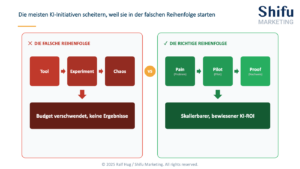 Unternehmen, die direkt mit einem Pilotprojekt starten, ohne vorher ein klar definiertes Pain-Problem identifiziert zu haben, erreichen selten den Proof – also einen messbaren geschäftlichen Nutzen und Nachweis.